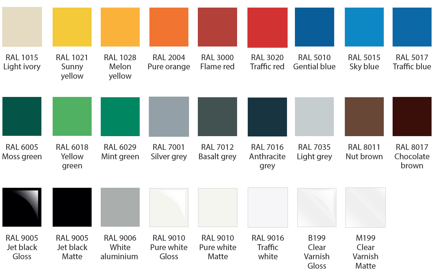 Tekintse meg színválasztékunkat! Igény esetén, felár ellenében egyedi RAL szín keverése is lehetséges!