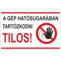 A gép hatósugarában tartózkodni tilos tábla kültéri kivitelben, 3 mm habosított PVC táblára kasírozva, A4 méretben.