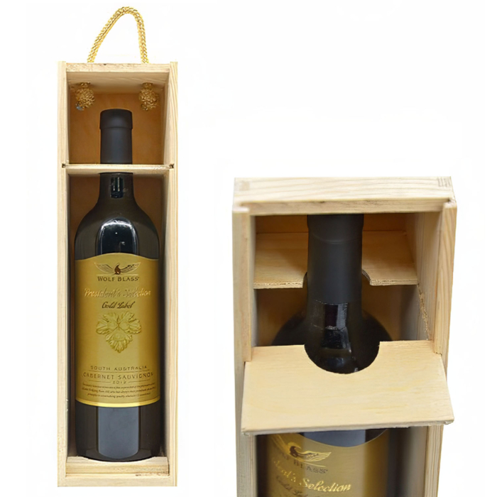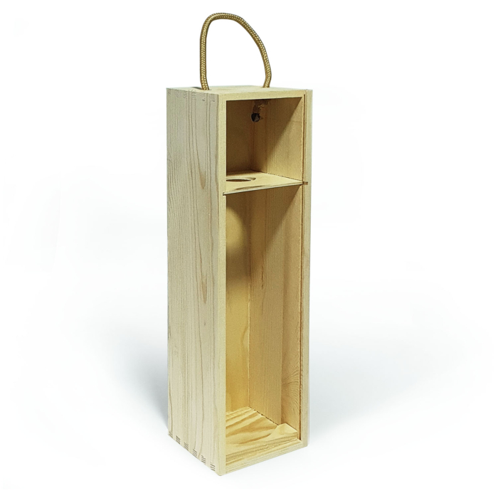 Fa boros doboz, egy üveg bor tárolására, melyben az üveg nyaka rögzíthető. Előlapja fehér színű, vastag lakkréteggel borított, nyomtatható!