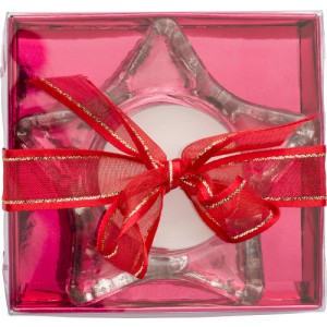 Csillag alakú, üveg gyertyatartó egy mécsessel, fényes, piros ajándékdobozban, szalaggal dekorálva.