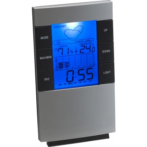Digitális időjárásjelző állomás. Falra is szerelhető ébresztőóra, naptár, hőmérő és páratartalommérő háttérfénnyel. Az elemet tartalmazza.