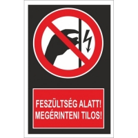 Feszültség alatt! Megérinteni tilos tábla, kültéri kivitelben, 3 mm habosított PVC táblára kasírozva, A4 méretben.