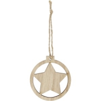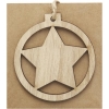 Fa karácsonyfadísz csillag mintával. Egyenként csomagolva kraft papírkártyával. MDF.