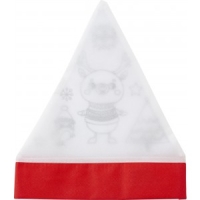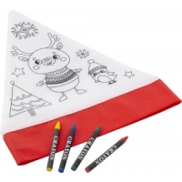 Színezhető mikulássapka 4 db zsírkrétával (zöld, piros, sárga, kék színben). Egyik oldalán előre nyomtatott, színezhető mintával. Nemszőtt anyag, 80 g/m2.